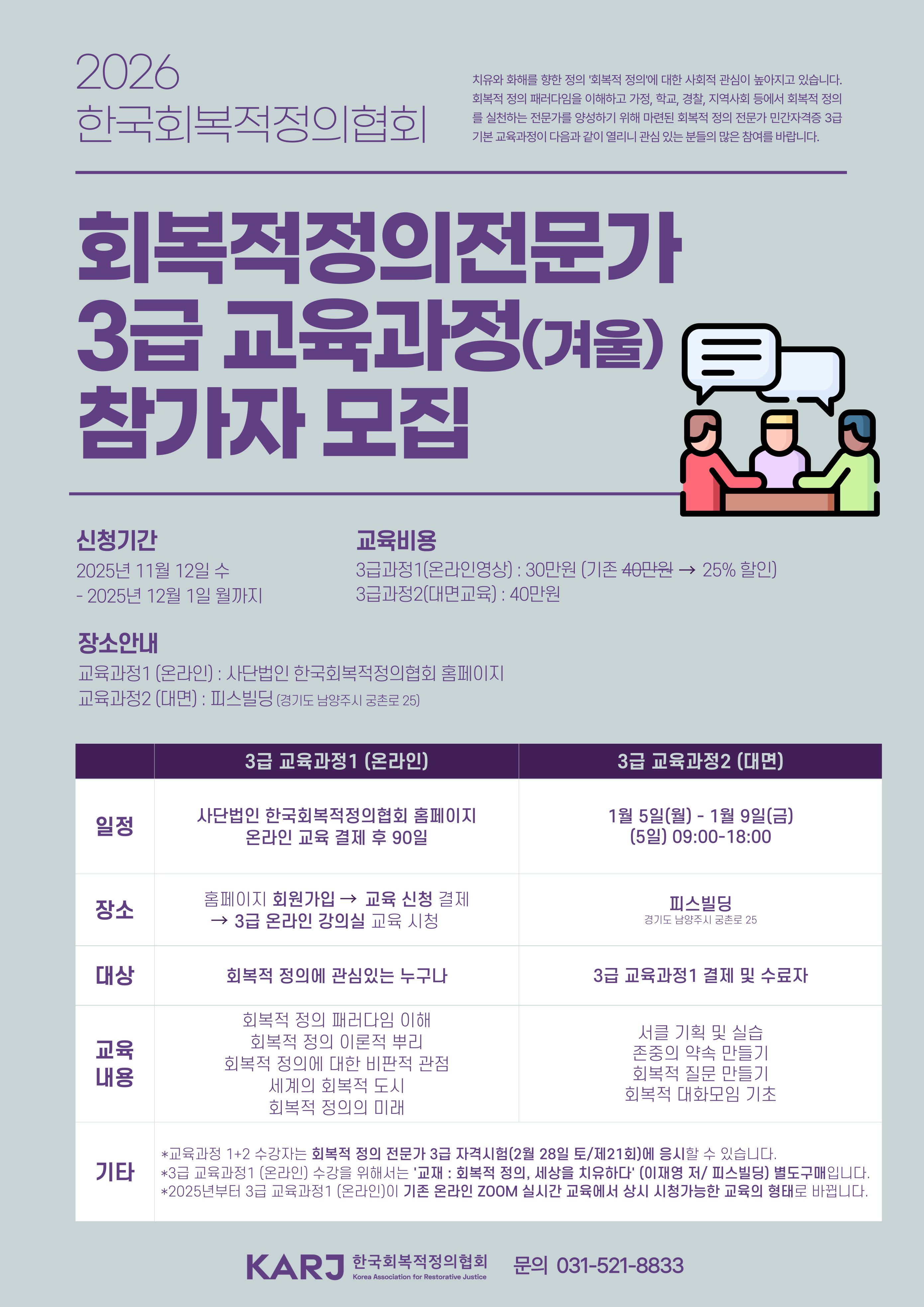 ☑️11월 21일(금) 회복적 정의와 학교폭력 l 실천 l 윤구식(회복적정의협회), 전상희(갈등해결과대화), 박성일(한국비폭력대화), 정동혁(평화비추는숲) l 학교폭력에 대한 회복적 접근의 방향과 실제. |